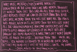 This release on the Polydor Label by The Dogs D’Amour (categorised on Wikipedia as ‘Blues Rock’) in 1990 on CD (1988 on record) was the band’s second album and featured 3 hit singles in the UK. The Tony Hancock connection is with the final track, ‘Wait Until I’m Dead’, which was not only dedicated to Tony Hancock on the inner sleeve but also featured an edited version of the close out segment from the ‘Pieces of Hancock’ Pye recording when Tony advises the listener ‘thank you for buying the record or if you are listening to it in a record shop, don’t mess about, buy it!’ Illustrated are a copy of both the album cover and the lyrics of the song dedicated to Tony Hancock.