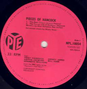 Released in 1960 as a follow up to This Is Hancock, this release featured a series of extracts with specially recorded links featuring Tony. Side 1 featured The East Cheam Drama Festival, a 20 minute extract from the program of the same name. The second extract on side 1 is a 9 minute extract entitled The Secret Life of Anthony Hancock. This ‘Test Pilot’ extract was from the programme The Diary and is probably the best known sequence from the Radio Half Hours owing to the number of times this extract was played on the Radio, especially during ‘Stewpot’s Choice’, a weekend radio programme in the 70’s. Side 2 features a 12 minute extract from The Publicity Photograph and a further 12 minute extract from The Threatening Letters. All of the extracts were heavily edited. The front sleeve features the same photo as on the main UK release of This Is Hancock and the jigsaw effect makes for an interesting cover. However, the reverse of the cover is interesting in that it contains a photo of all of the cast and underneath a numbered drawing intended to show who is who. Unfortunately, the names are all in the wrong place! Released on the Pye Plum label, early releases featured a dark plum label, which later changed to the almost pink label.